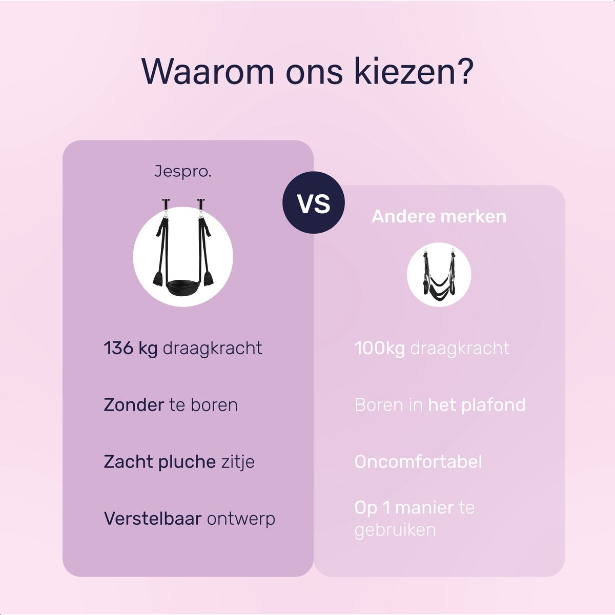 Klaar voor avontuur? Met de Jespro Sex Schommel ontdek je nieuwe dimensies van plezier en intimiteit. Of je nu op zoek bent naar nieuwe ervaringen of je relatie wilt verdiepen, deze schommel brengt je dichter bij elkaar. Dus, waar wacht je nog op?