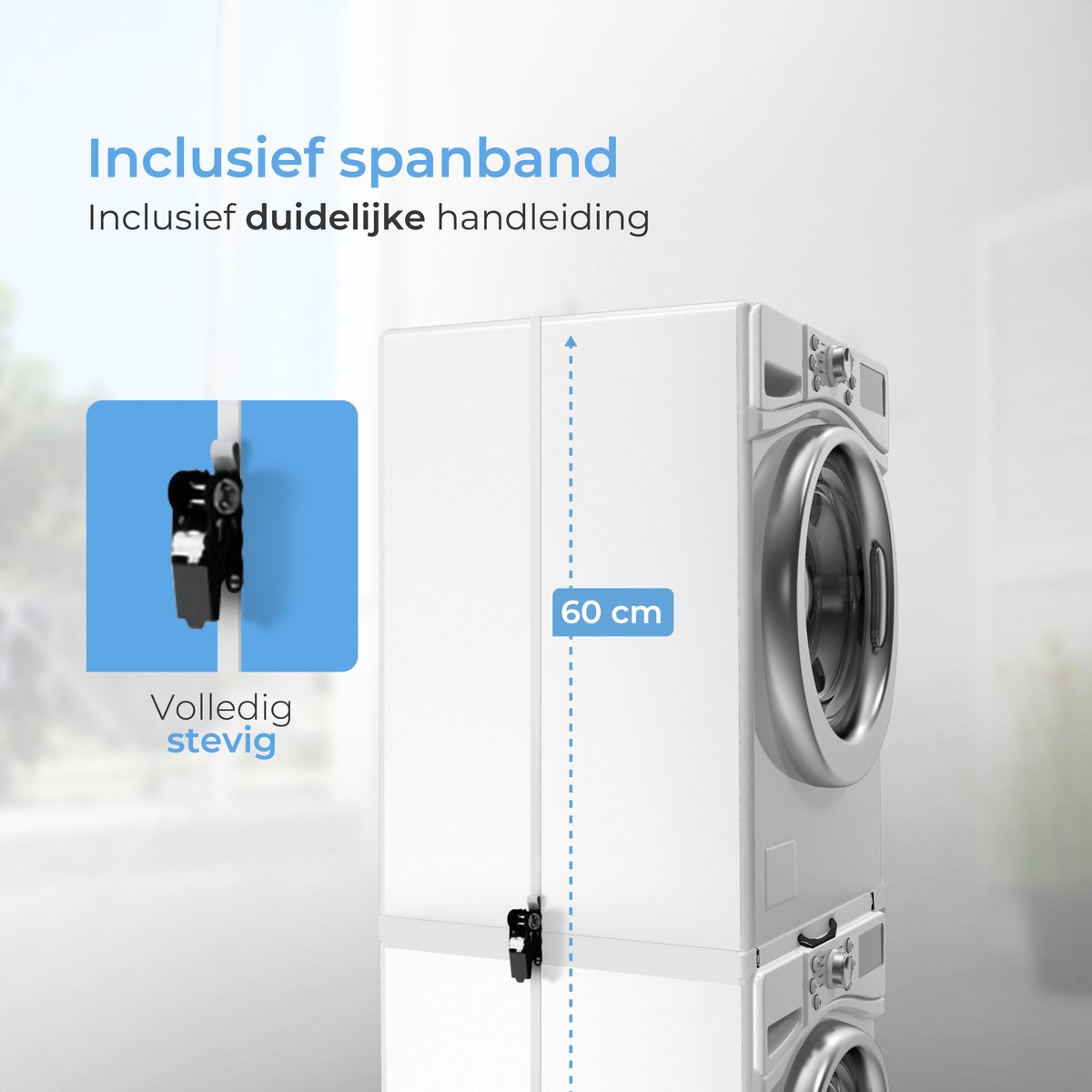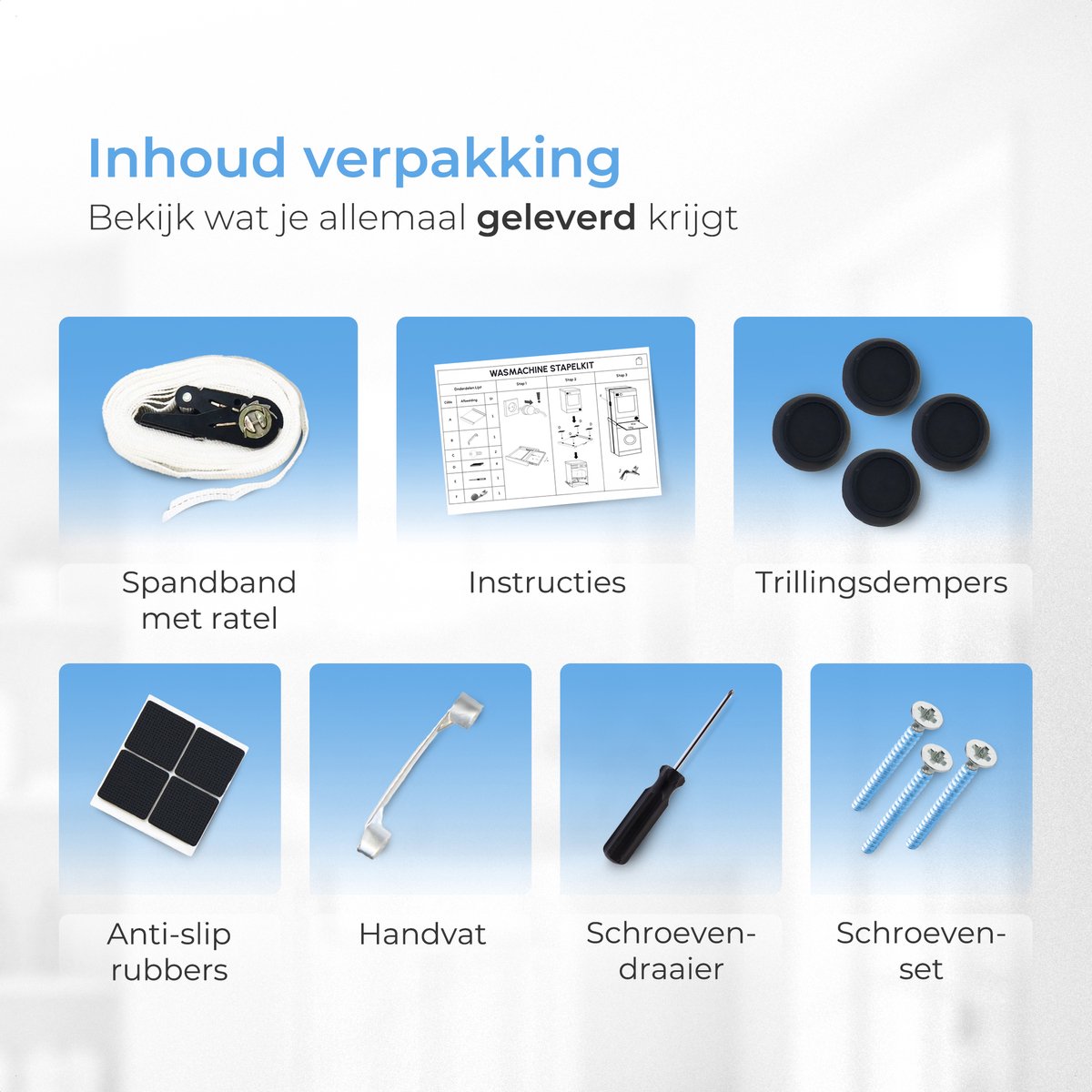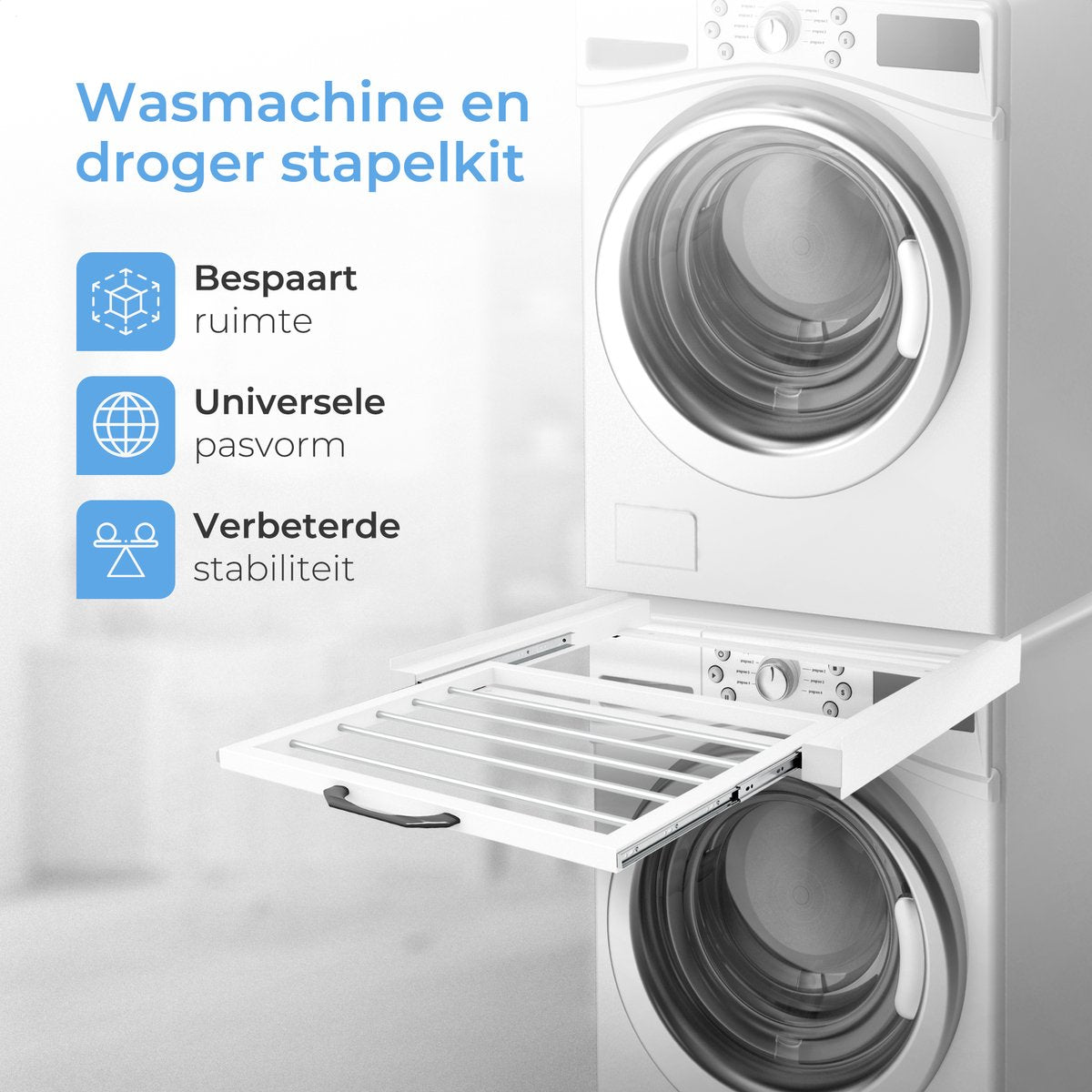 De stapelkit is ontworpen om de ruimte in elke kamer te optimaliseren, of het nu in een klein appartement, een druk huishouden of een compacte wasruimte is. Met deze kit kun je efficiënt gebruik maken van de beschikbare ruimte zonder in te boeten op stabiliteit en veiligheid.